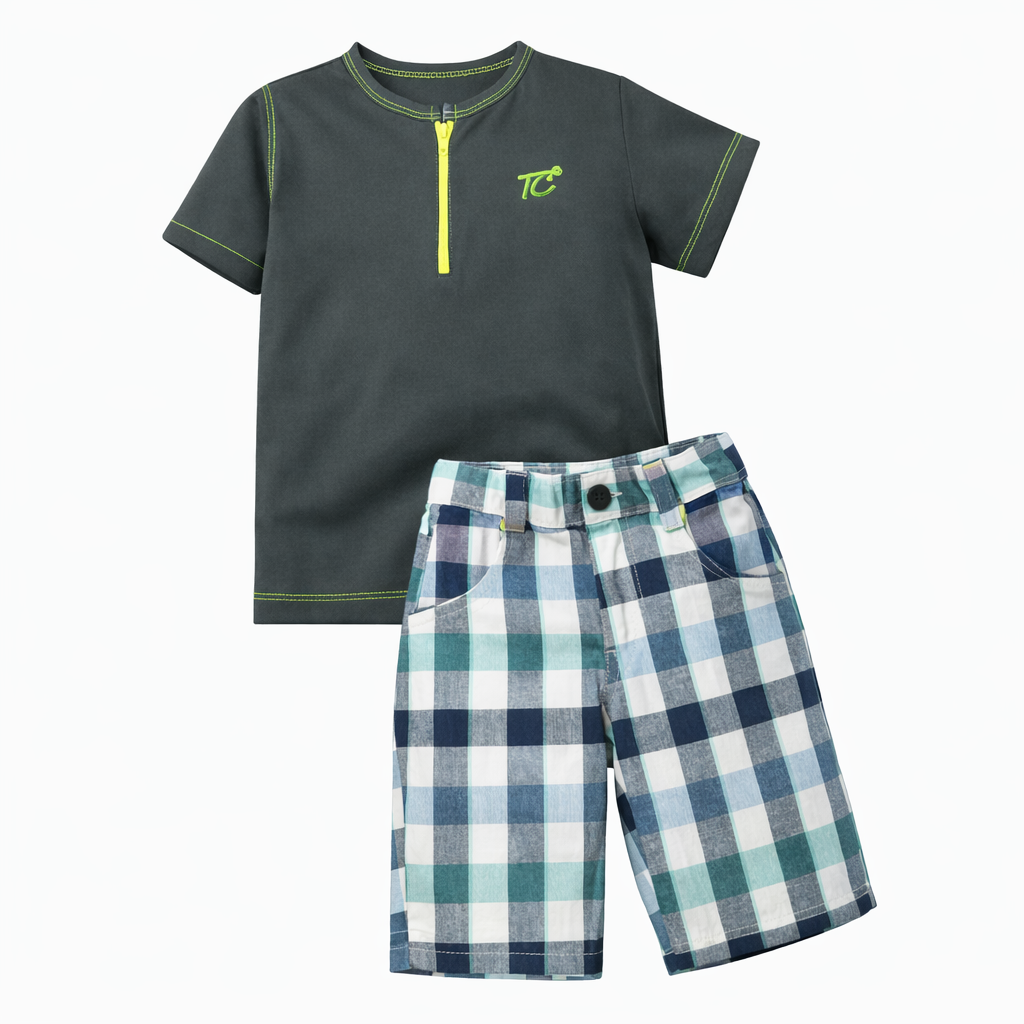 O conjunto infantil foi desenvolvido para oferecer conforto, praticidade e elegância, sendo perfeito para passeios, festas, aniversários, eventos, escola, fotos ou uso no dia a dia. A camiseta infantil possui zíper frontal e um design moderno, enquanto a bermuda xadrez de sarja infantil garante resistência e liberdade de movimento.