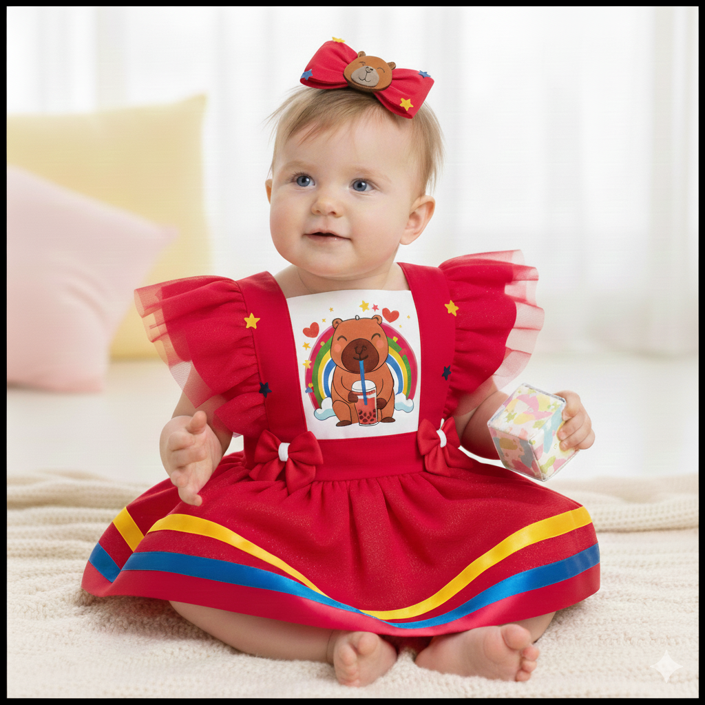 Possui estampa de capivara temático, babados em tule, laços laterais e acabamento com fitas coloridas.